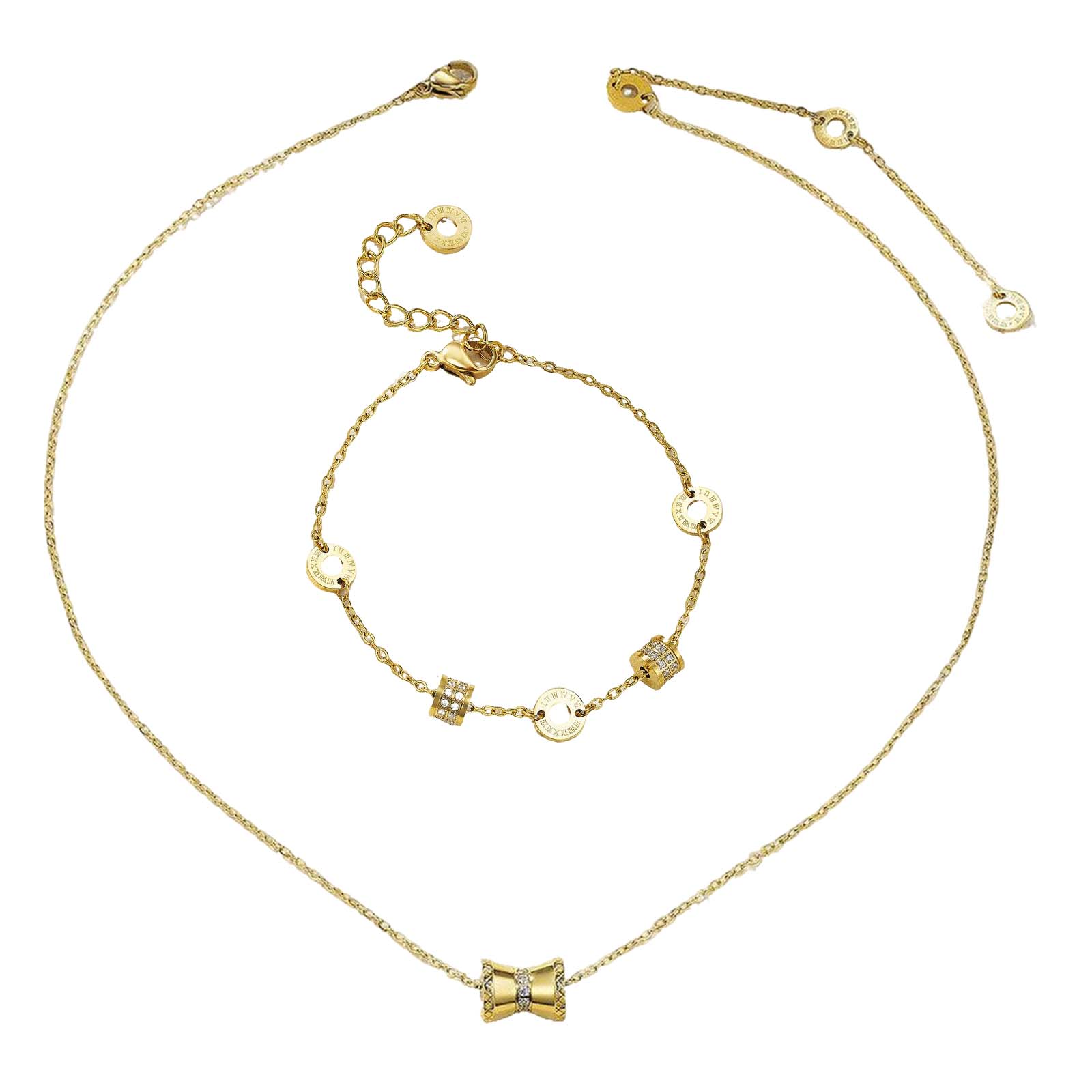 Detail Highlights:The necklace’s bow design with full CNC stones exudes sweet-luxury charm; the bracelet’s Roman numeral elements and stone-set barrel beads blend retro and modern aesthetics. Every detail reflects thoughtful craftsmanship in this cohesive set.