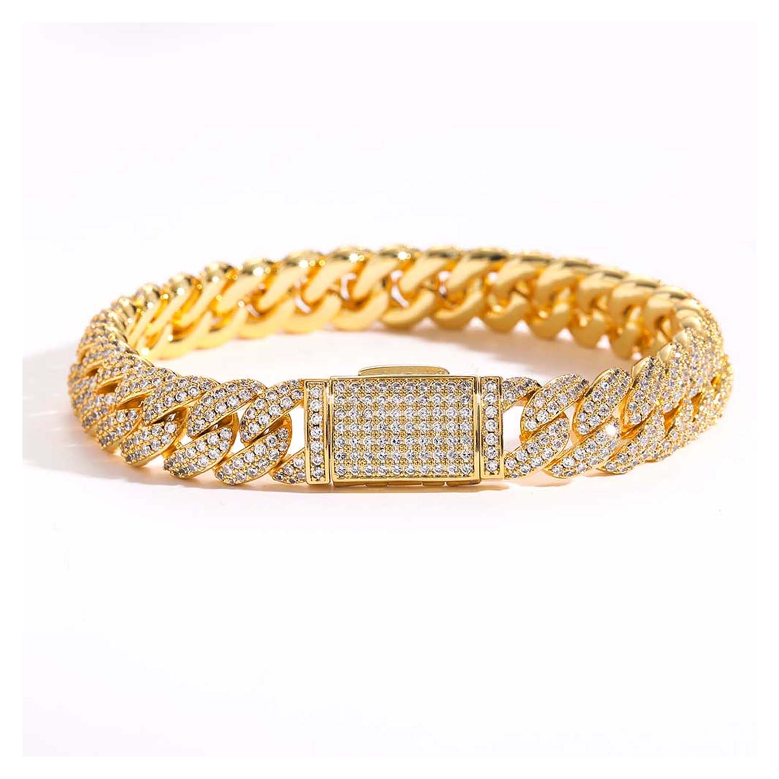 1.Design: Features a classic Cuban link pattern with sparkling copper zircons set in gold-toned brass, creating a refined yet bold shine that embodies streetwear swag, suitable for both men and women.